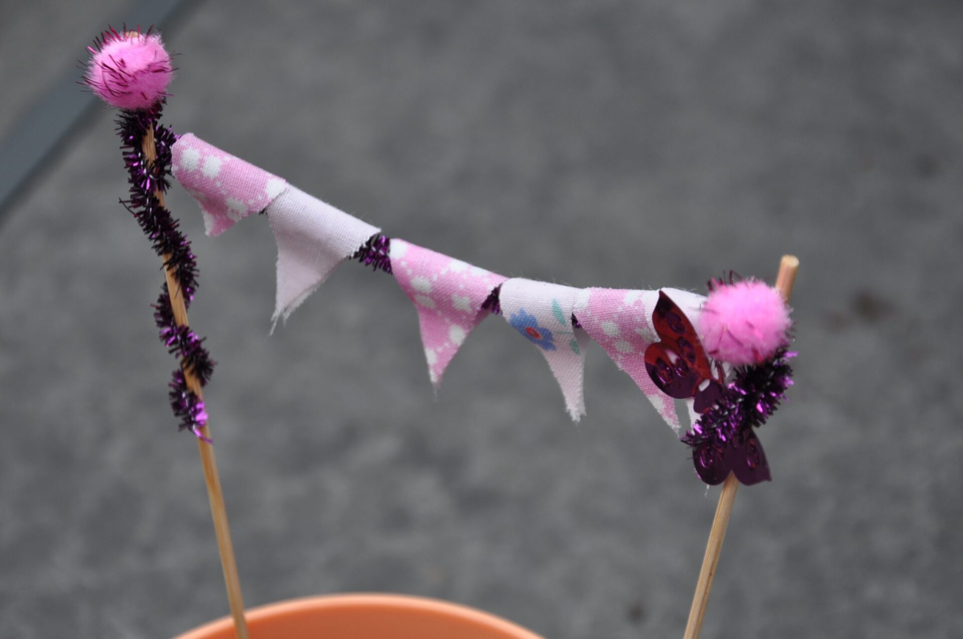 In het huisje kwamen enkele pompoms en een bloempje. De dennenappel kreeg elfenstof over zich heen (hele fijne groene glitters) en roze pompoms als versiering opgeplakt. Van twee lange satéprikkers en een glinterend ijzerdraadje uit de knutselkoffer van de meisjes maakte ik een vlaggenlijn.