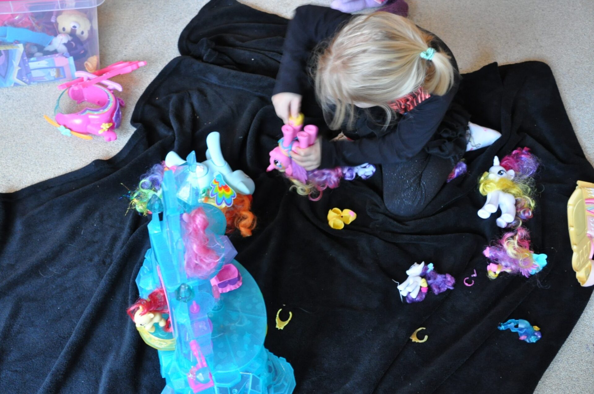 Verder zijn die discolampen natuurlijk geweldig! Vooral nu het vroeg donker wordt (en helemaal met een zwart kleed eronder) vallen de lampjes goed op. Als je de bewegende disco te druk vindt, dan druk je nog een keer op de knop en blijven de lampen gewoon branden. Dit demonstreren mijn dochters heel graag aan alle bezoekende kindjes. Jongens en meisjes hebben er inmiddels mee gespeeld. Bij ons valt het kasteel in de smaak omdat … tja, omdat ze gewoon fan zijn en álles van My Little Pony leuk vinden. We hebben dan ook erg veel paardjes en met een beetje proppen kunnen die best met z’n allen tegelijk in de disco. Ook de grotere Pony’s.