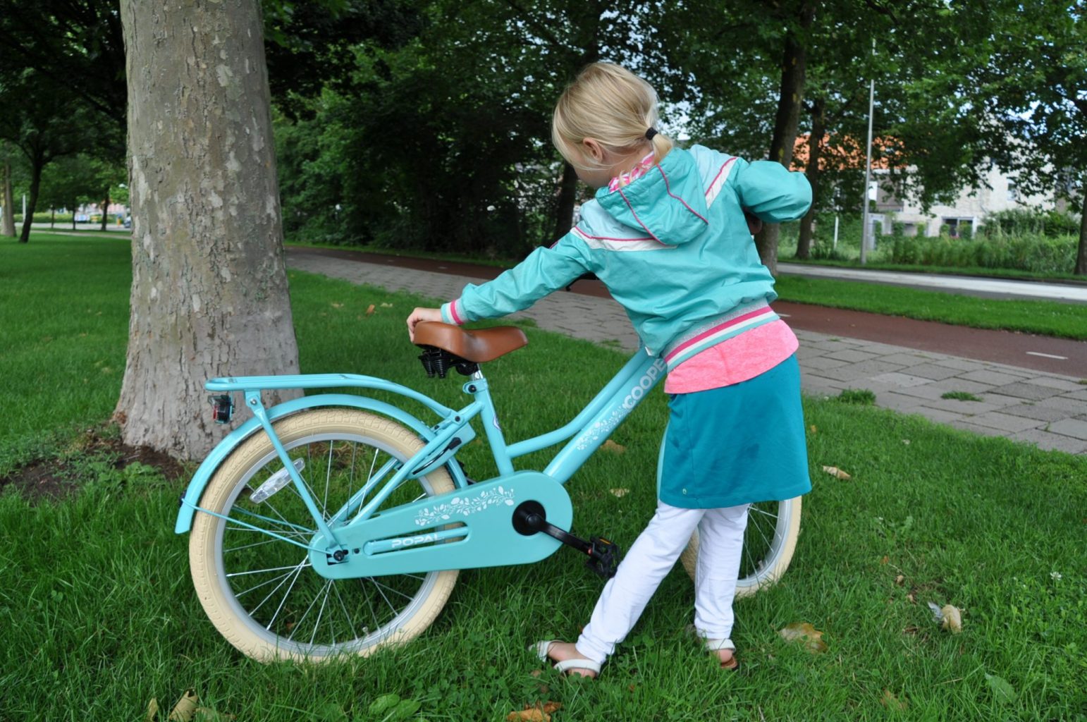 In ieder geval was ik gered: mijn dochters zouden niet meer voor schut staan met te kleine fietsjes, maar gingen allebei een maatje groter. We mochten bij Fietsen op Fietsen een mooi exemplaar uitzoeken en dat liet ik aan de meisjes over. Omdat de nieuwe fiets om beurten voor hun beiden zou zijn, was de keuze aan hun samen. Ze waren het er direct over eens. Het moest de turquoise Popal Cooper worden, momenteel is deze afgeprijsd naar 179 euro en ze hebben een actie dat je op alle fietsen een gratis slot krijgt. Het grote verschil met de oude fiets van mijn meisje, waar we een los slot bij hadden. Overigens heeft ze nu ook voor het eerst een standaard! Erg handig, want nu kan ze de fiets tenminste netjes parkeren. Heel erg leuk is ook het bagagerek voor. Met Sinterklaas krijgt ze daar een mandje of krat voor om spulletjes mee te nemen.