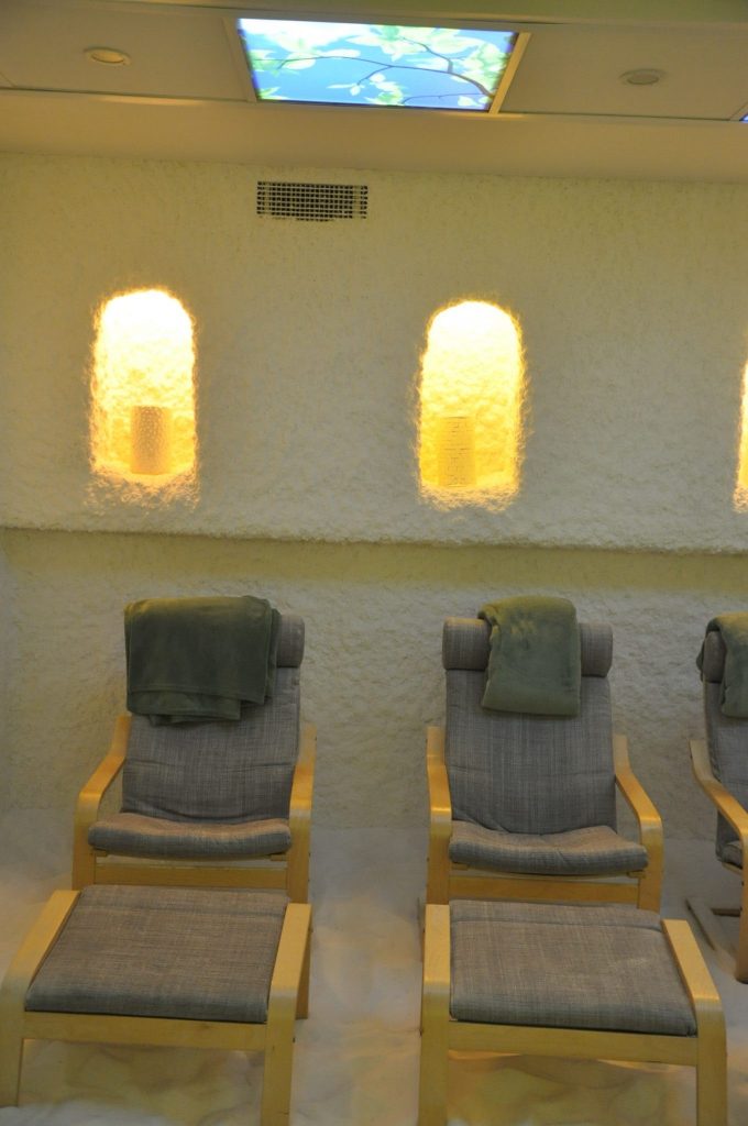 Daarna gingen we naar de kleedruimte waar we onze spullen in een kluisje konden doen. We kregen (net als in het zwembad) hoesjes over onze schoenen vanwege de hygiëne in de zoutkamer. Ook moesten we een haarnetje op. In de zoutkamer zelf lag een flinke lading zout overal op de vloer en het zat ook op de muren. Hiertussen stonden fijne stoelen met dekentjes klaar en een tafel met tijdschriften. Het licht was gedimt en er klonken ontspannende zeegeluiden, zodat je het geluid van de klimaatregeling niet hoort en lekker kunt wegdromen als je dat wilt. Veel mensen doen tijdens een sessie even de ogen dicht. Je gaat ontspannen zitten en blijft een uur in de zoutkamer. Verder hoef je niets te doen. Ik heb zelf het dekentje lekker over me heen getrokken, even mijn ogen dichtgedaan en daarna nog een tijdschrift gelezen.