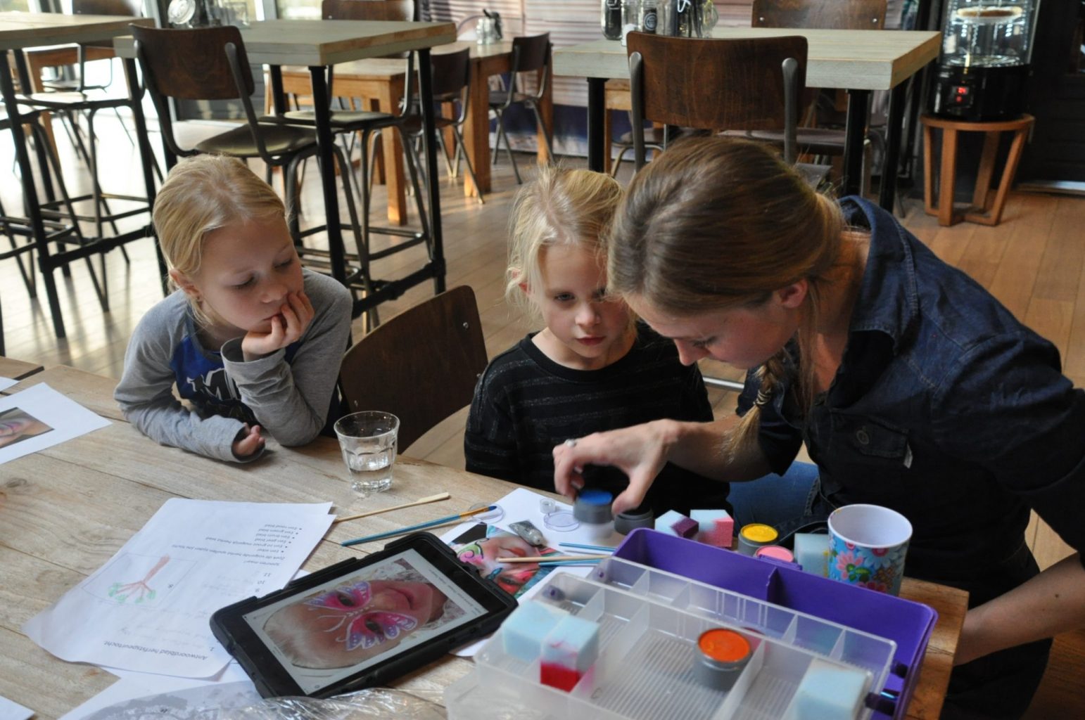 Na afloop kregen we limonade en lekkers in het restaurant en werd er geschminkt. Achteraf hadden ze dit beter andersom kunnen doen, dan hadden de kinderen langer plezier gehad van de schmink. Precies om 6 uur waren we namelijk pas terug in het vakantiehuisje, waar papa het eten al klaar was. Dat was maar goed ook, want we wilden graag naar het voorlezen gaan en dat zou om half 7 alweer zijn… Hier waren we de enigen, maar daardoor hadden de kids wel alle aandacht. Mijn oudste mocht om de beurt ook voorlezen (yay, lezen was er verder niet van gekomen) en wat keek ze trots! Toen snel in bad en naar bed, de schmink had er dus echt maar heel even op gezeten. 😎