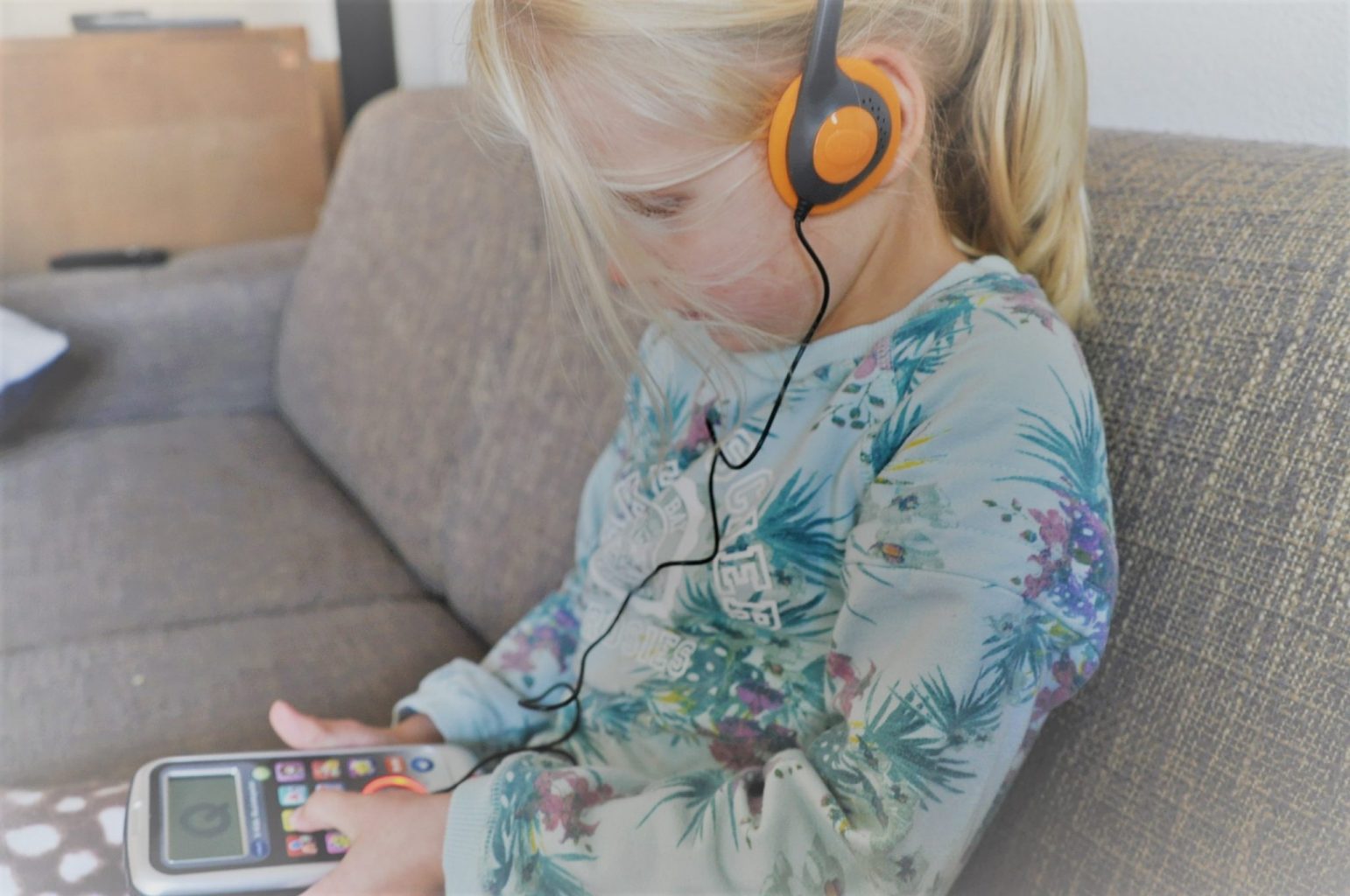 De muziek op het apparaatje bestaat uit kinderliedjes. Er zijn verschillende muziekstijlen, liedjes om mee te leren tellen, liedjes om het alfabet te leren en liedjes met danspasjes. Aangezien beide dochters regelmatig meezingen, weet ik dat “B I N G O en Bingo is zijn naahaaam” hier dé grote favoriet is. Ondanks de kinderliedjes vindt ook mijn oudste dochter van 6 het nog leuk, al heb ik het apparaat vooral voor de jongste bedoeld. Een ideaal ding voor entertainment op de achterbank tijdens lange autoritten. Wij gebruiken hem ook op de slaapkamer, als mijn meisje ’s ochtends iets te vroeg wakker wordt en we nog niet willen dat ze beneden televisie gaat kijken, dan mag ze in bed even luisteren. Voor het slapengaan werkt het ook fijn, om de 1-op-1 momentjes van de andere zus niet te verstoren. Tijdens het muziek luisteren is er geen verleiding om stiekem naar de andere slaapkamer te sluipen. Zo hoeft deze mama minder boos te worden tijdens het samen voorlezen of Slaapklets, voorheen kwam er nog wel eens een zus binnenlopen en dat is niet zo leuk tijdens dit moment van exclusieve aandacht. De VTech muziekspeler houdt ze op een rustige manier bezig. Kortom, we zijn er blij mee!