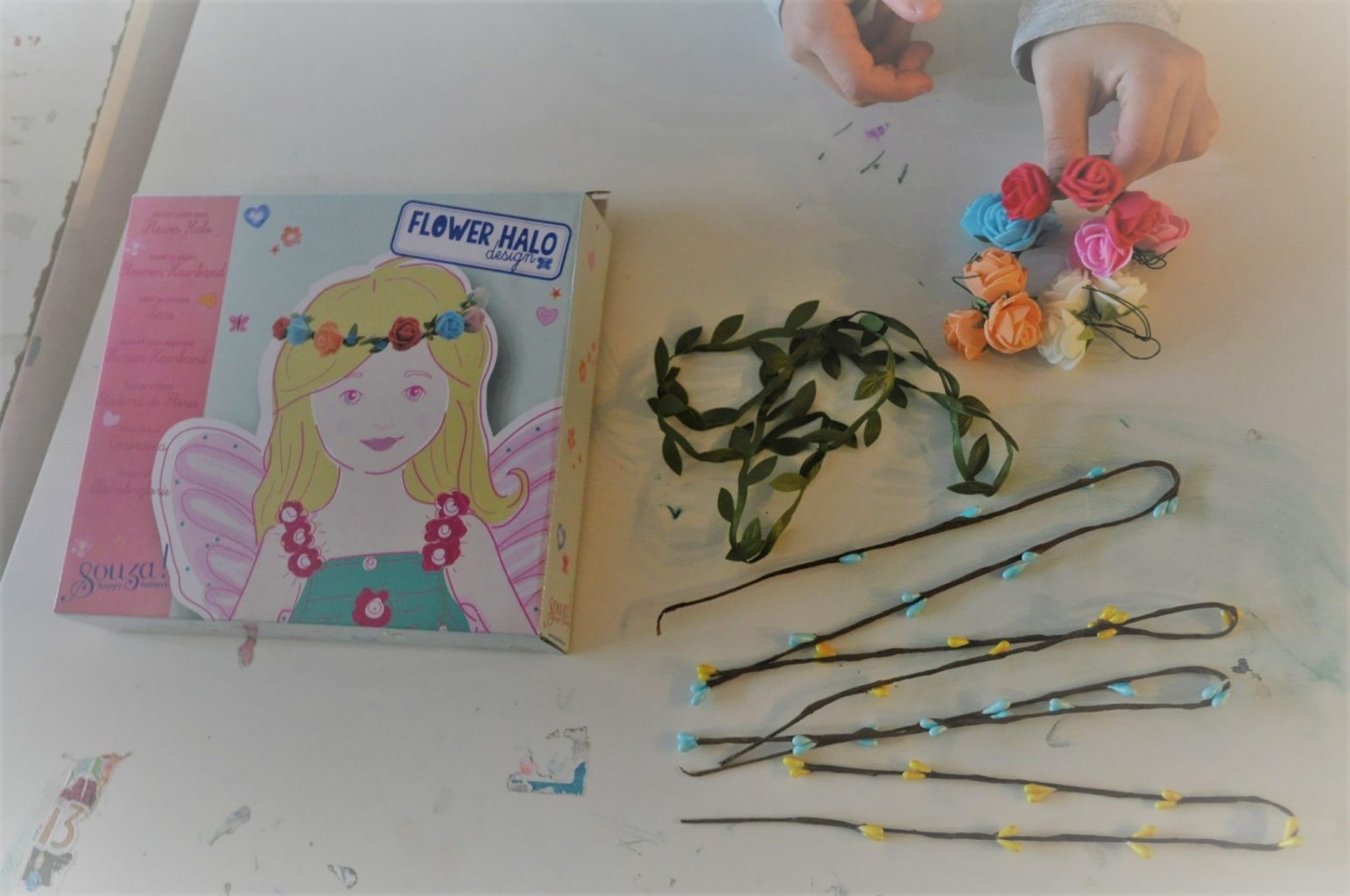 Beide dames kregen van Souza de Flower Halo knutselset, waarmee je een bloemenkrans kunt maken waarmee je eruit ziet als een elfje! Uit de doos kwamen ijzerdraadjes met gele en blauwe knopjes, een groen lint dat er uit ziet als een tak van bladeren en allemaal losse roosjes met ijzerdraadje. Het knutselen wijst zich dus eigenlijk vanzelf. Je meet met de 2 lange draden het hoofd op en wikkelt alles om elkaar heen op de juiste maat. Je maakt de blauwe en gele knopjes mooi. Dan voeg je steeds een knutselelement toe. Eerst het groene blad. Daarna kun je de roosjes er omheen draaien. In een patroontje of willekeurig, net hoe jij het leuk vindt.