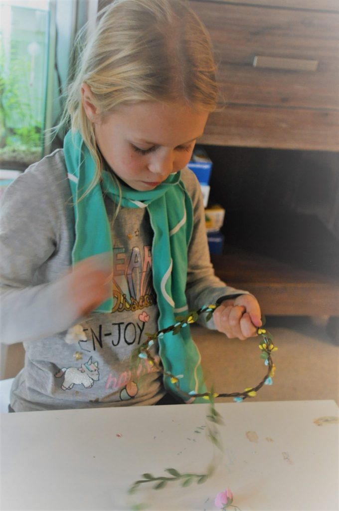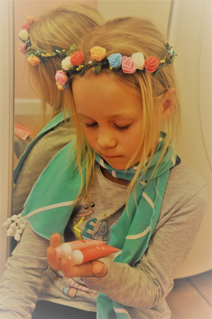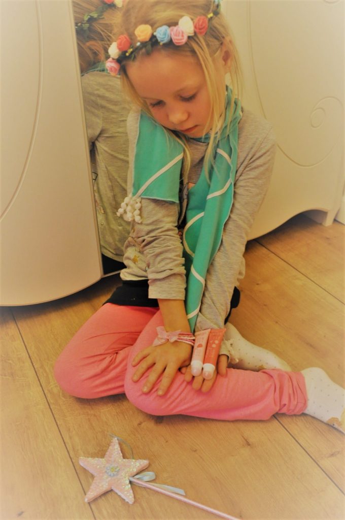 Het was even wennen voor mijn dochters van 5 en 6 jaar, ze hadden nog niet eerder zo geknutseld. Deze set is bedoeld voor kinderen vanaf 6 jaar en daar ben ik het mee eens. Mijn 5-jarige dochter had veel hulp nodig van mama en raakte gefrustreerd omdat het niet lukte. Zuslief van 6 daarentegen vond het geweldig. Met zorg koos ze een patroontje uit en werkte ze haar bloemenkrans zo mooi mogelijk af. Zeer geconcentreerd en ze vond het ontzettend leuk. De motoriek van mijn dames scheelt 15 maanden (én de oudste heeft sowieso meer geduld voor dit soort dingen). Ik zou het dus aanraden voor meisjes vanaf 6 jaar en het lijkt me een leuke activiteit voor bijvoorbeeld een kinderfeestje in elfenthema. We waren ongeveer een kwartier bezig met knutselen. Daarna mochten de meisjes zichzelf in de spiegel bewonderen en deden we een lipglossje op.