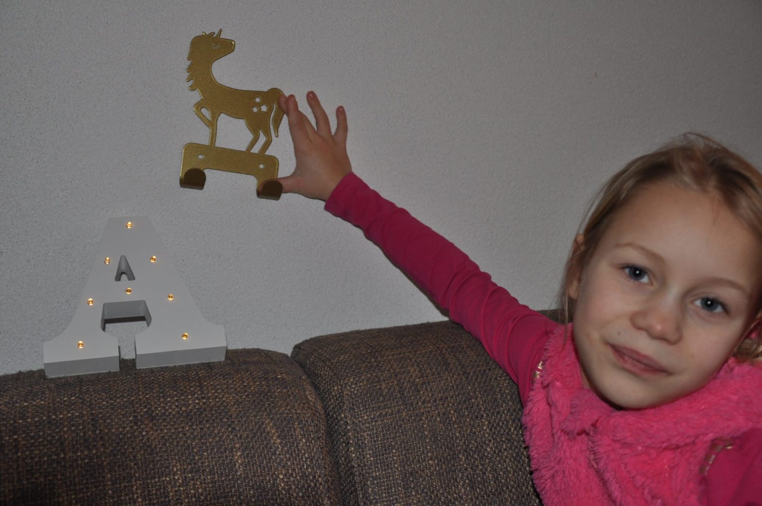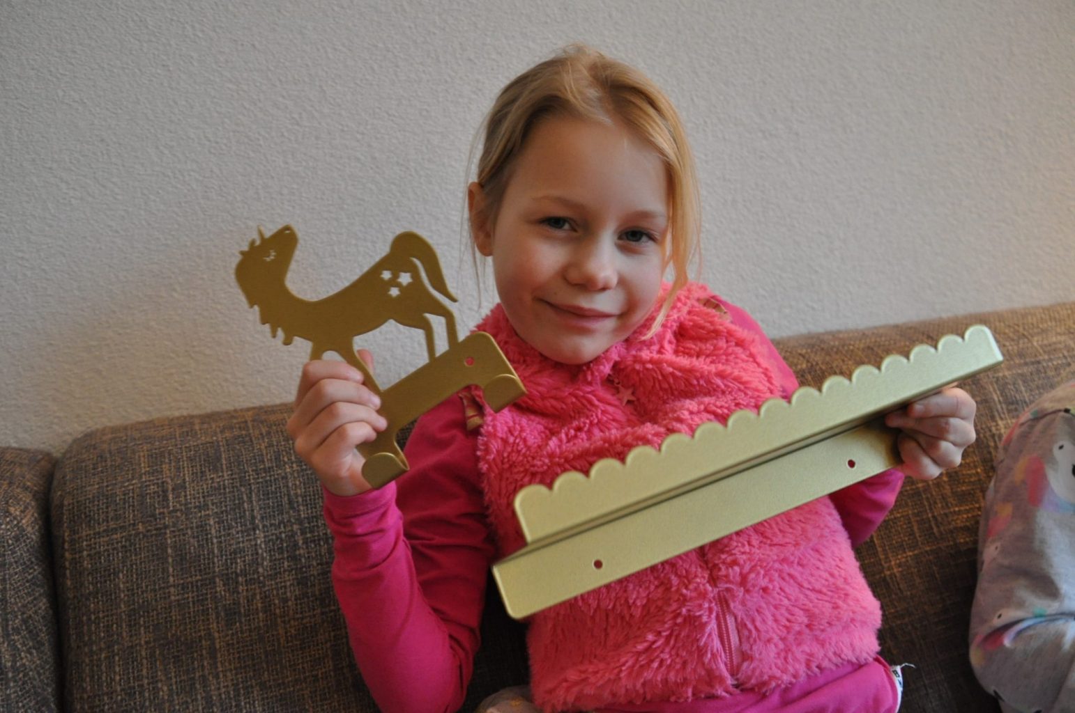 Bij Dreumes Enzo voeren ze dit toffe merk en deze webwinkel liet mij onlangs weten dat ze nu ook eenhoorn wandhaakjes hebben. Zo gaaf, want deze is er dus ook in het goud! Precies de kleur waar mijn dochter van droomt voor haar nieuwe slaapkamer. En net als haar zusje is ze gek op eenhoorns. Hij is er overigens ook in het wit, lichtroze en de nieuwste Eina kleur ‘plum’ (een prachtige lichtpaars tint). Mooi genoeg qua ontwerp om de kinderjasjes in de gang aan te hangen, maar wij bewaren deze kinderkameraccessoire voor het nieuwe huis. We kregen hem toegestuurd samen met een geweldig matchend gouden wandplankje. Kan ze leuk kettingen, jurkjes of een ochtendjas aanhangen en op het plankje vrolijke accessoires of een ingelijste tekening zetten.