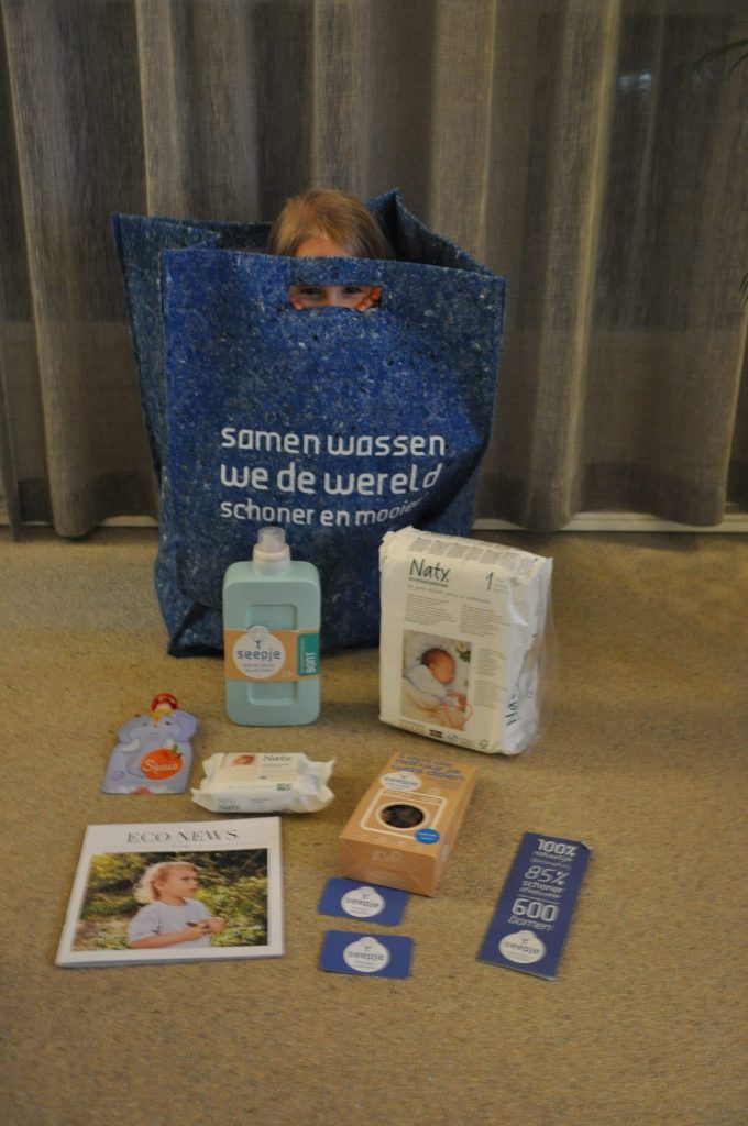 Bij ecomerk Seepje mochten we ruiken aan wasmiddel in een potje en raden welke variant het was. Een van de oprichters vertelde ons over het ontstaan van dit bijzondere merk en hoe ze er op gekomen zijn om notenschillen om te toveren in een duurzaam wasmiddel. Een merk met een prachtig verhaal! Ik heb al eens een sample met schilletjes ontvangen en geprobeerd: je hebt dus een klein katoenen zakje waar je 4 schilletjes in stopt en daarmee maak je tot 4 wasbeurten lang je was echt goed schoon. Het werkt! Er zijn ook varianten met een geurtje op de markt gebracht door Seepje. Mijn portemonnee laat het helaas niet altijd toe om duurzaam te kopen, maar Seepje wasmiddel werkt, het is gaaf bedacht en veel beter voor het milieu dan synthetische producten. In de megagrote wastas die we meekregen zat een verpakking met 30 superschillen, een grote fles wasmiddel voor de bonte was, Naty newborn luiers, Naty ongeparfumeerde billendoekjes voor de gevoelige huid, een bpa-vrij Squiz zakje voor zelfgemaakte fruithapjes. Bovendien ontvingen we nog een klein luiertaartje zoals ze die ook in de stand hadden staan met een kroontje en onze blognaam er op. Helemaal leuk en ook in die goodiebag zat weer een pak Naty newbornluiers en billendoekjes. Allemaal zonder chemische stoffen.