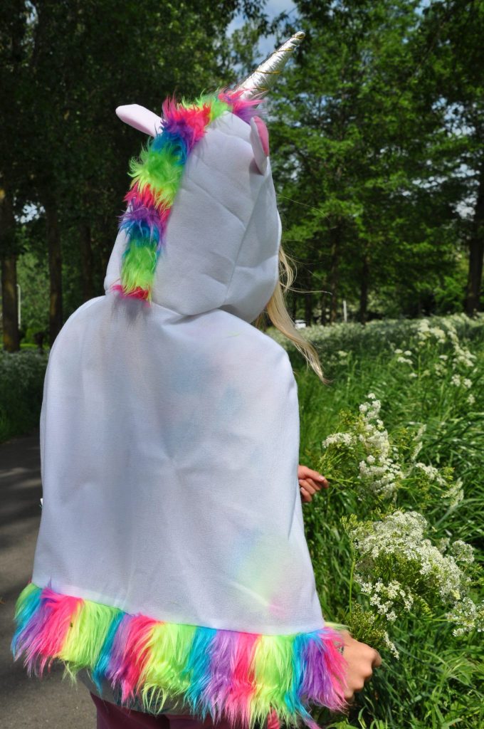 Na het uitpakken van al die feestelijkheden konden de meisjes niet wachten om de eenhoorncapes alvast uit te proberen. En wat is er nu leuker dan je even eenhoorn voelen in de natuur? Dus plukten we bloemetjes en deden we net alsof we gras aten in kostuum.