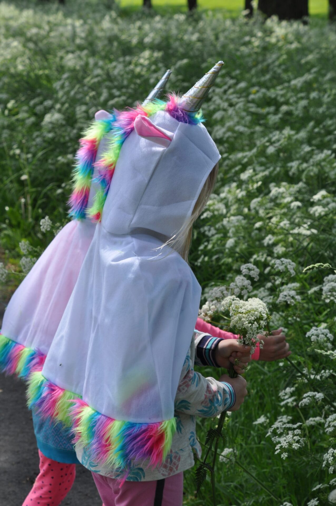 Na het uitpakken van al die feestelijkheden konden de meisjes niet wachten om de eenhoorncapes alvast uit te proberen. En wat is er nu leuker dan je even eenhoorn voelen in de natuur? Dus plukten we bloemetjes en deden we net alsof we gras aten in kostuum.