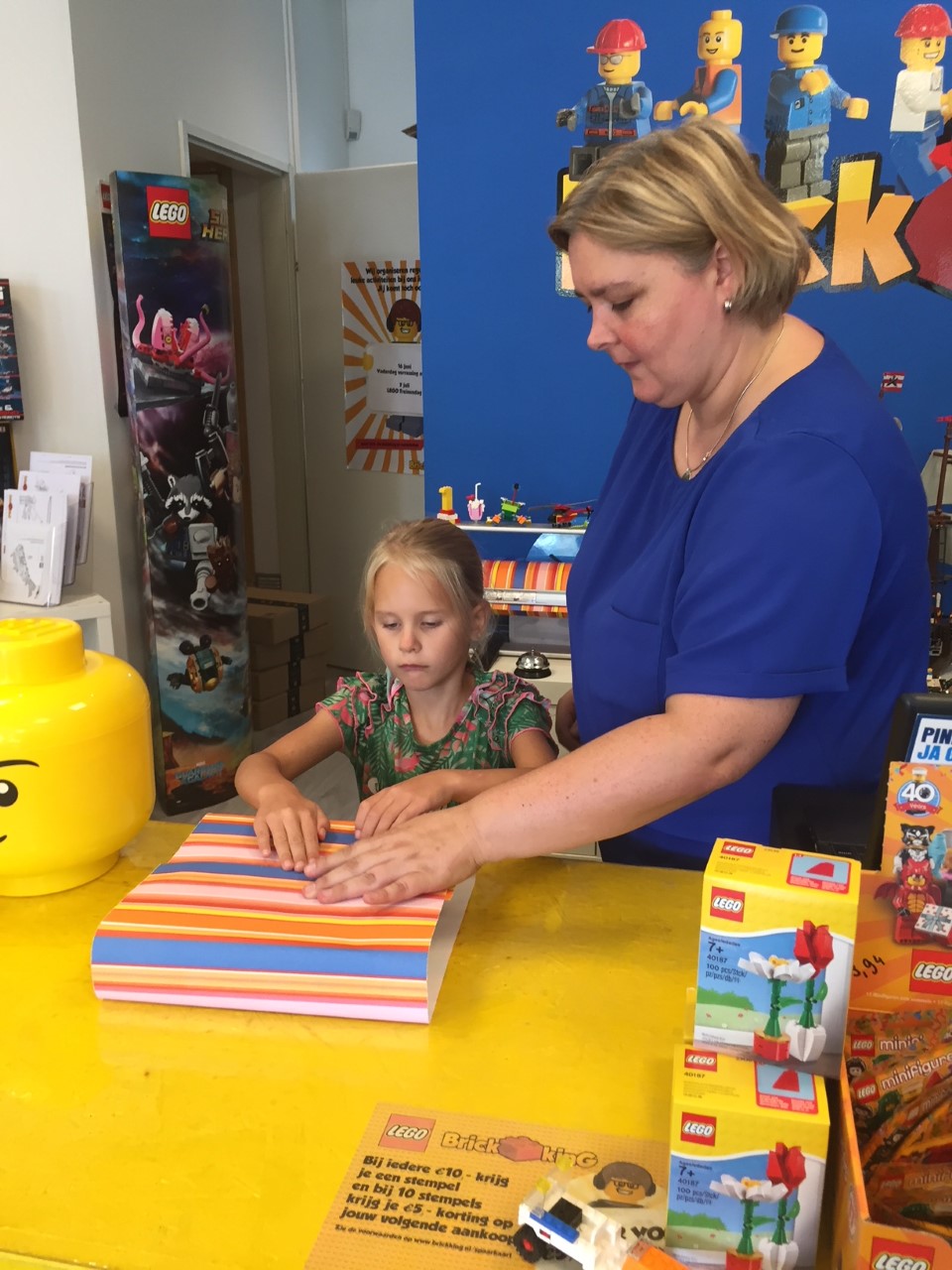 En daarmee kwam dé wens van mijn jongste dochter uit. Ze wil later heel graag in een cadeautjeswinkel werken en de hele dag cadeaus inpakken. Bij de Brick King kreeg ze ‘les’ en mocht ze helpen.