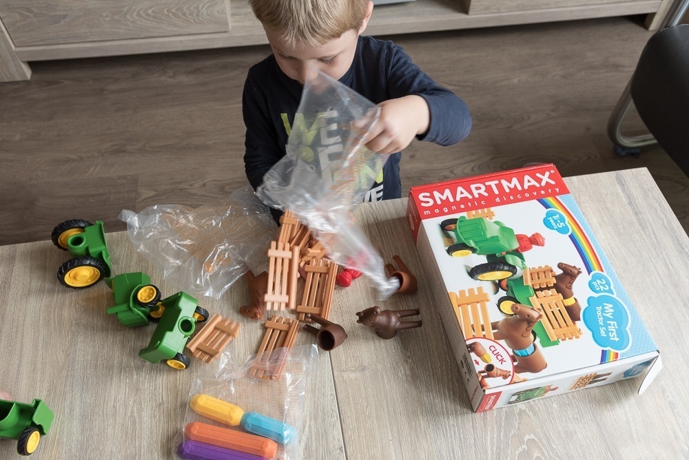 Ook dit jaar was er weer de Speelgoed van het Jaar verkiezing. Eén van de genomineerden in de categorie 1-3 jaar was de My First Tractor Set van SmartMax, en wij mochten deze set testen! SmartMax staat bekend om zijn constructie speelgoed waarbij gebruik gemaakt wordt van magnetische kracht. Hierdoor kun je snel en gemakkelijk allerlei bijzondere constructies bouwen. Door het grote formaat van de onderdelen en de uitgesproken kleuren is het speelgoed al geschikt voor kinderen vanaf 1 jaar.