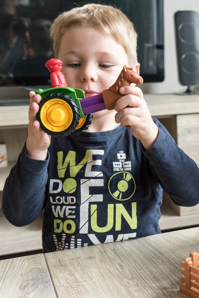 Ik was aangenaam verrast door het materiaal van de tractor en de paarden. De paarden zijn van zachter materiaal en de tractor is van stevig plastic, maar voelt ook ‘zacht’. Bovendien zijn alle onderdelen lekker groot, en dus goed vast te pakken door de kleine handjes. En groot voordeel, niet in te slikken door onze kleinste man. Lego is hier bijvoorbeeld erg favoriet, maar dat is echt niet te combineren met een kruipende baby. Deze set dus wel. Alle 3 de jongens vonden het speelgoed op hun eigen manier leuk. De oudste twee konden goed bouwen met de onderdelen en de fantasie werd geprikkeld. De een wilde tractor het liefst zoals die hoort, de ander maakte liever eigen creaties. Daarnaast vond de kleinste man de beestjes vooral erg interessant, maar ook de tractor en wagen vond hij leuk om rond te rijden.