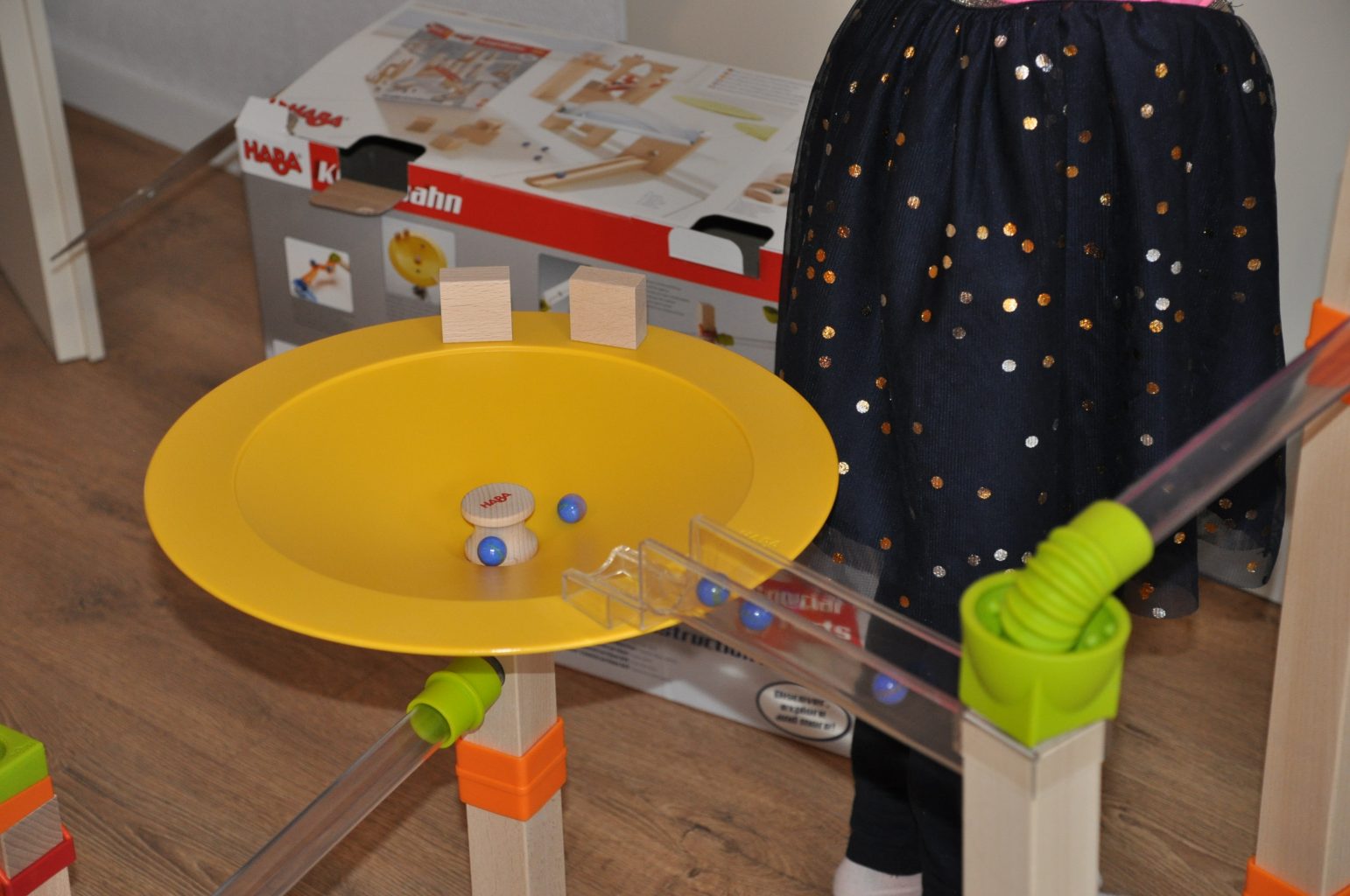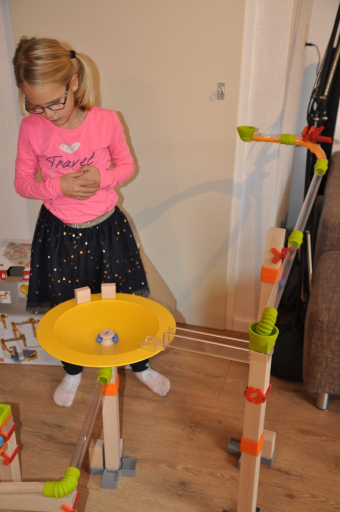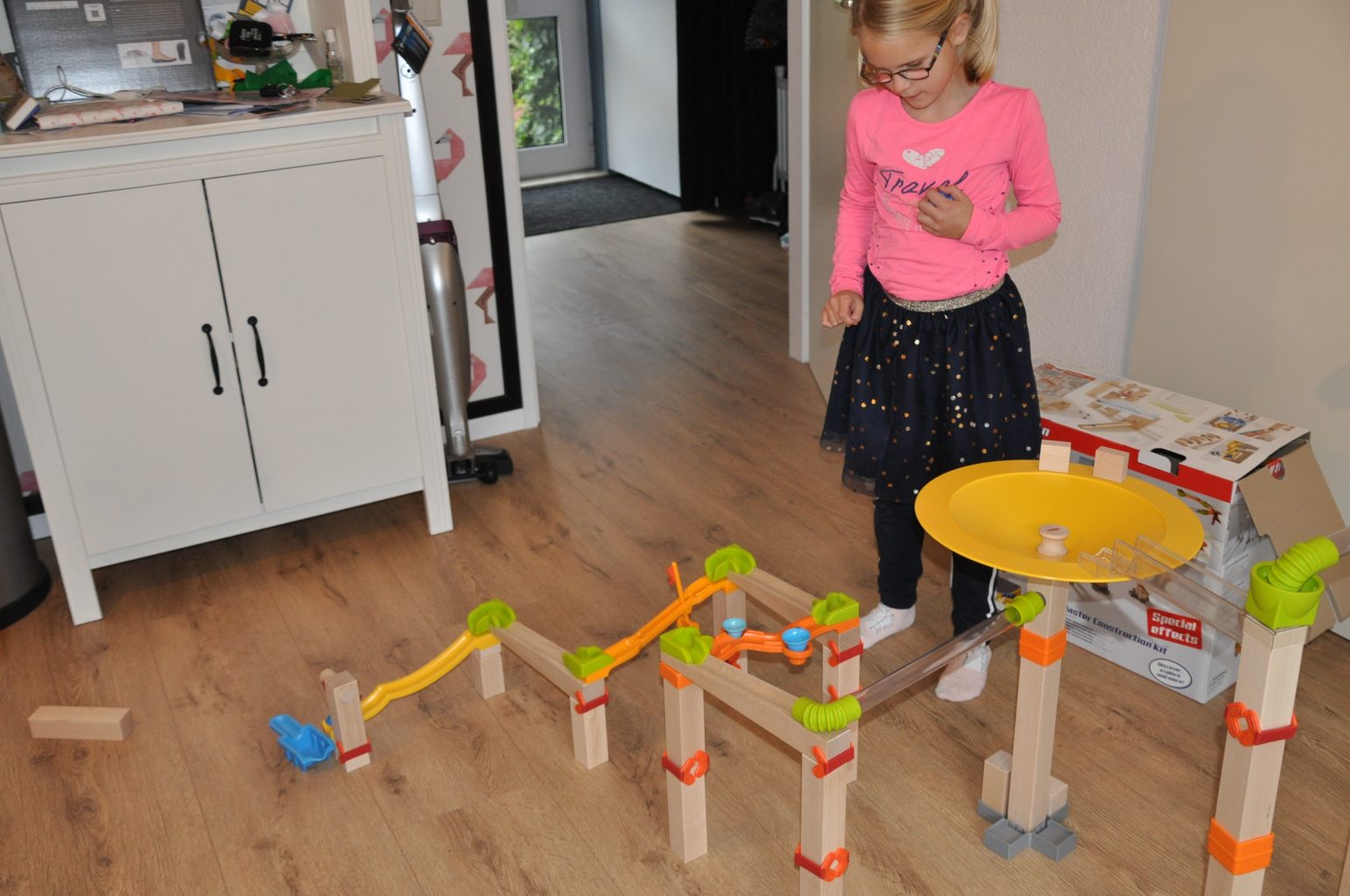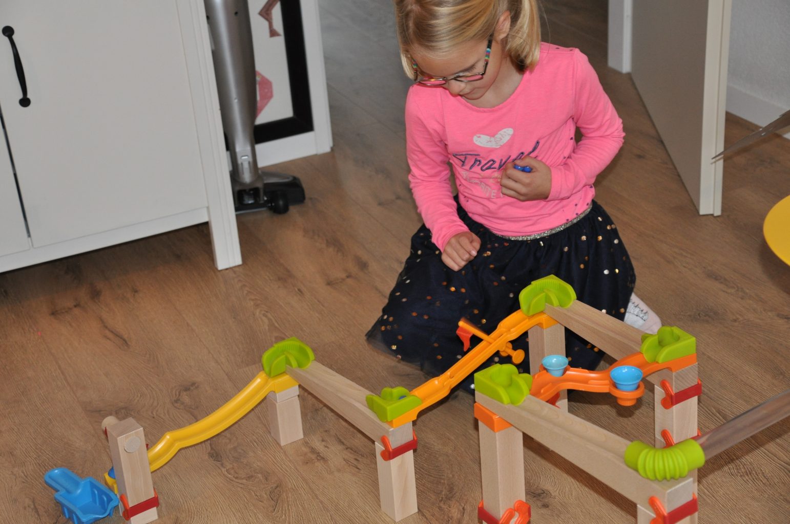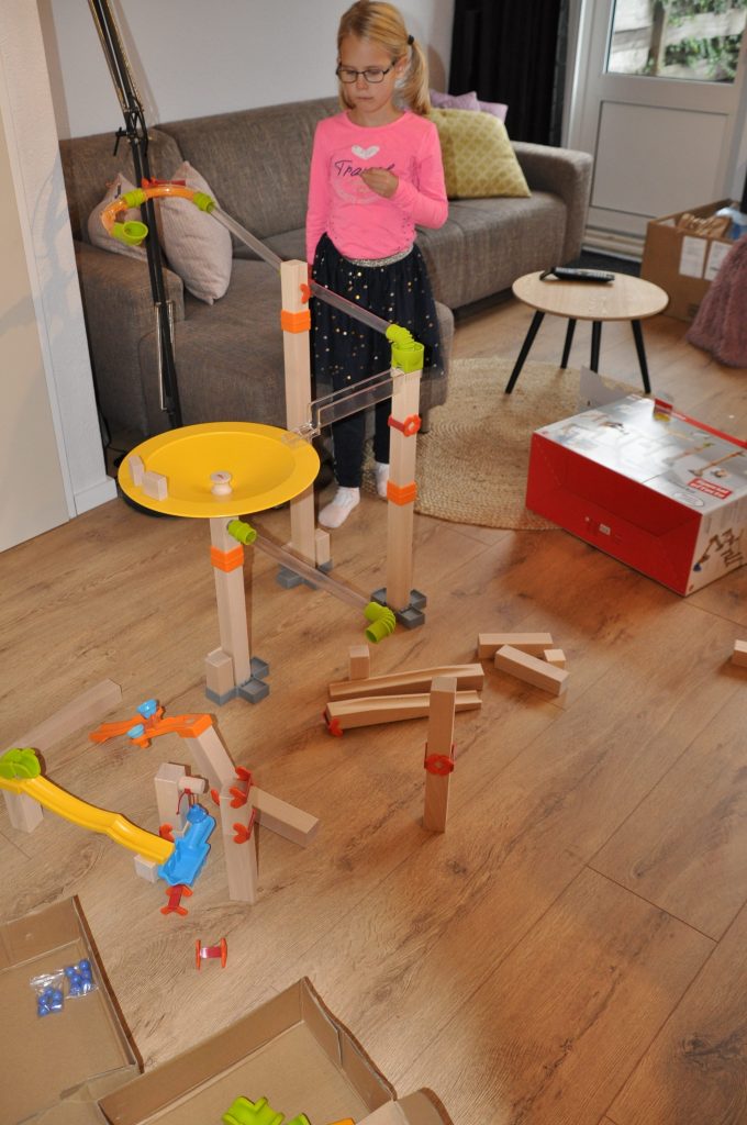 Vergis je overigens niet, ook met een voorbeeld is het nog best een uitdaging om de baan in elkaar te zetten. Alles moet in balans zijn, anders stort je bouwwerk in en moet je weer opnieuw beginnen. Verder is het belangrijk dat je natuurlijk heel hoog begint zodat de knikkers met behulp van de zwaartekracht naar beneden kunnen rollen. Dit was voor dochterlief een goede beproeving voor haar frustratietolerantie. Ik moest er echt bij helpen en ook toen hadden we veel tegenslag en stortte de baan weer (deels) in elkaar voordat we hem helemaal af hadden. We waren echt wel even zoet om het op een goede manier voor elkaar te krijgen. Trots dat we waren toen hij stond!