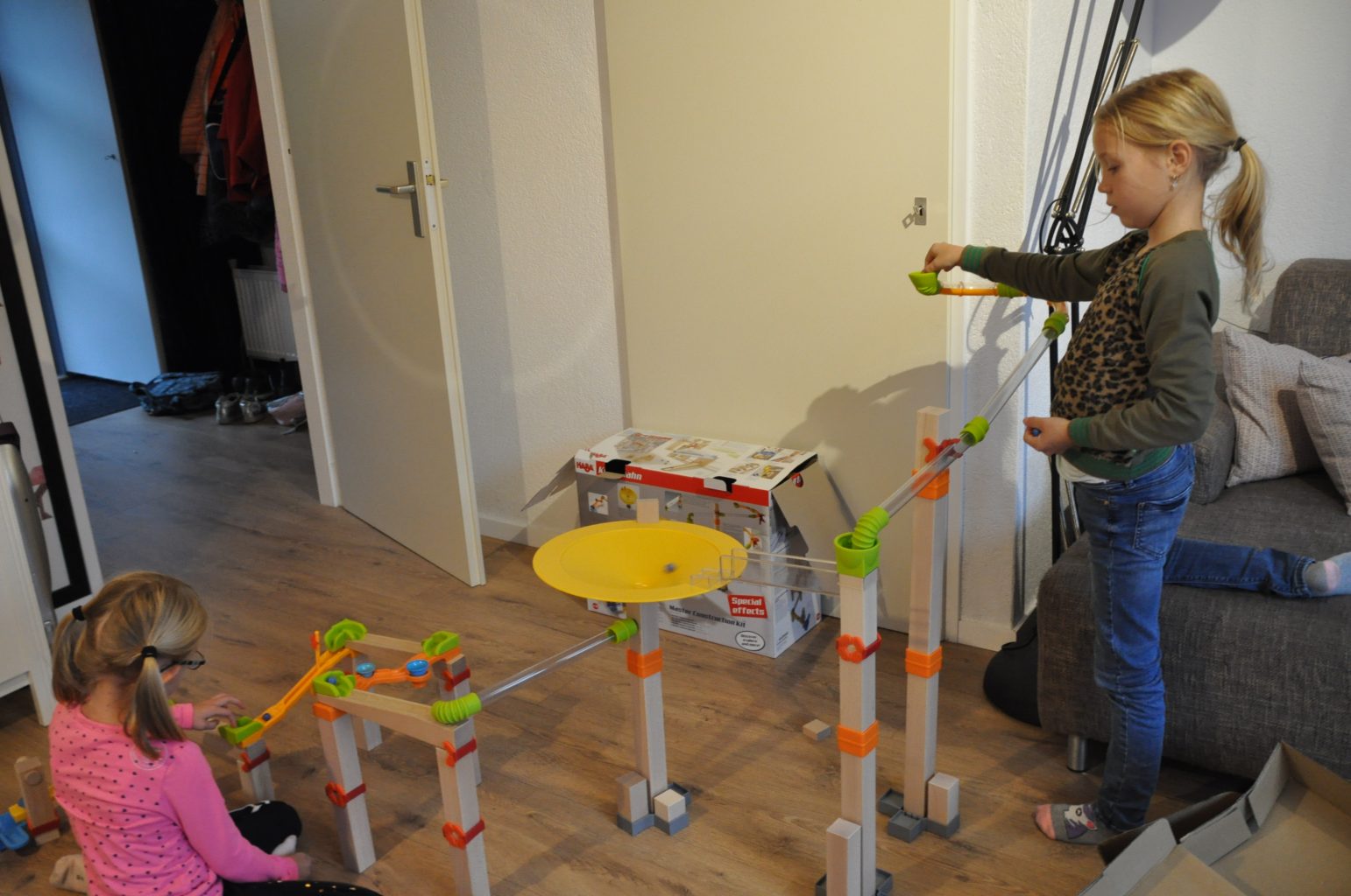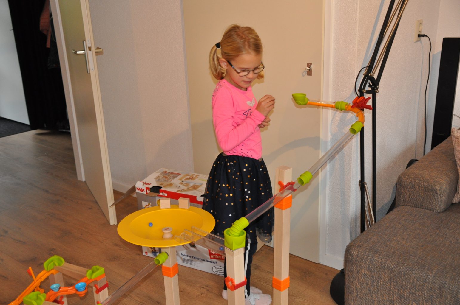 Daarna begon voor ons de volgende uitdaging: het vlot laten rollen van de knikkers. De verschillende delen van de knikkerbaan moeten precies goed op elkaar aansluiten. Verder was het heel belangrijk dat er steeds maar 1 knikker tegelijkertijd over de baan rolde. In het begin waren we iets te enthousiast en liep het parcours daardoor vast, wat tot gevolg had dat we de baan deels uit elkaar moesten halen om de knikkers los te krijgen uit bepaalde buizen. Gelukkig hadden we snel door waar we op moesten letten. Het laten rollen van de knikkers kunnen kinderen eindeloos herhalen, dat blijft leuk. Dat vond ook grote zus die bij thuiskomst zeer onder de indruk was van ons enorme bouwwerk dat zelfs met een klemmetje was vastgezet aan een lamp.