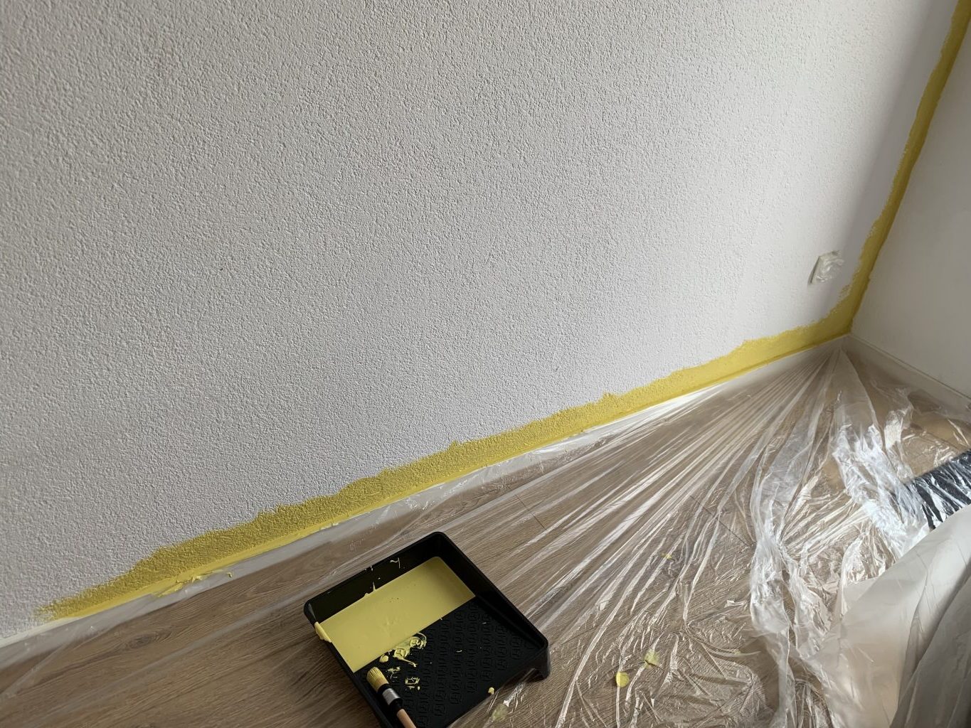 Extra voordeel: je zag op mijn witte muur heel erg een soort vierkant lopen vanwege structuurverschil op de muur. Een erfenis van vorige bewoners. Nu ik de rafelrand gelijk heb lopen met de bovenste lijn én nu de rest van een gele kleur is voorzien, zie je die lijnen ook niet meer. Zijn meteen weggewerkt! Erg fijn.