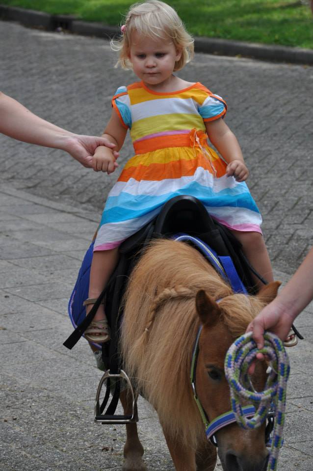 Zo hebben we voor mijn jongste eens via Pony Pret het paardje Amber geboekt. Ons meisje werd 2 jaar en is midden in de zomervakantie jarig, dus er zou weinig visite zijn. Voor 30 euro kwamen ze van Pony Pret bij ons thuis. De haren van Amber waren heel mooi gevlochten voor dit feestje en de jarige Jet vond het een geweldig cadeau. Zij mocht als eerste een ritje op de pony maken. Daarna konden de andere kindjes (1, 2 en 3 jaar) ook. De jarige mocht Amber nog een appeltje voeren. Het was voor alle aanwezigen een mooie belevenis. Je kunt ook naar Pony Pret toe voor een kinderfeestje, met kindjes tot 25 kilo. De kinderen maken dan een ritje, mogen borstelen en vlechten en eventueel kunnen ze nog een speurtocht doen of cakejes versieren.