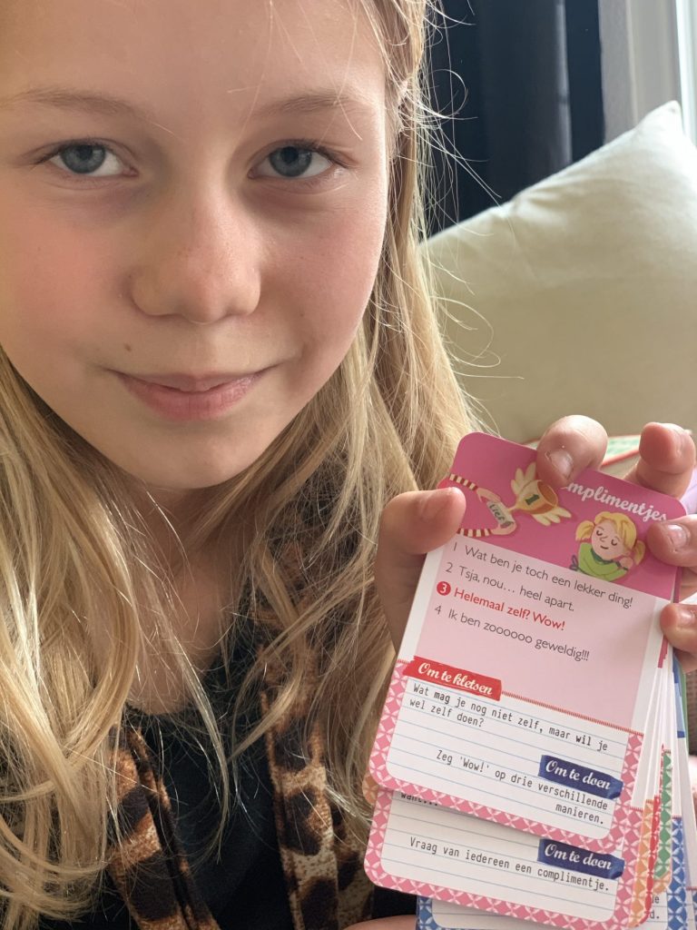 Mijn dochters houden wel van lekker kletsen. En van een spelletje. Dus wij hebben het gewone kletskwartet gespeeld. Ook dat was al erg geinig omdat de kaarten die je aan elkaar moet vragen heel grappig zijn. Zo vroeg ik aan mijn dochter ‘mag ik alsjeblieft een puppy?’ en vroeg ze mij ‘zullen we chips eten in plaats van aardappels?’, het is dus best grappig om aan elkaar je kaarten te vragen om een kwartet compleet te krijgen. Kwartetten is bovendien een lekker kort spel, dus ideaal voor ‘even tussendoor’ als je wel samen een korte break wilt maar geen tijd hebt om een compleet bordspel uit de kast te trekken. Zo hebben ze toch hun aandachtsmoment met mama op een leuke manier én je kunt meteen bepaalde zaken op een luchtige manier aan de orde brengen. Zoals hoe fijn het zou zijn als hun bureau opgeruimd was bijvoorbeeld.