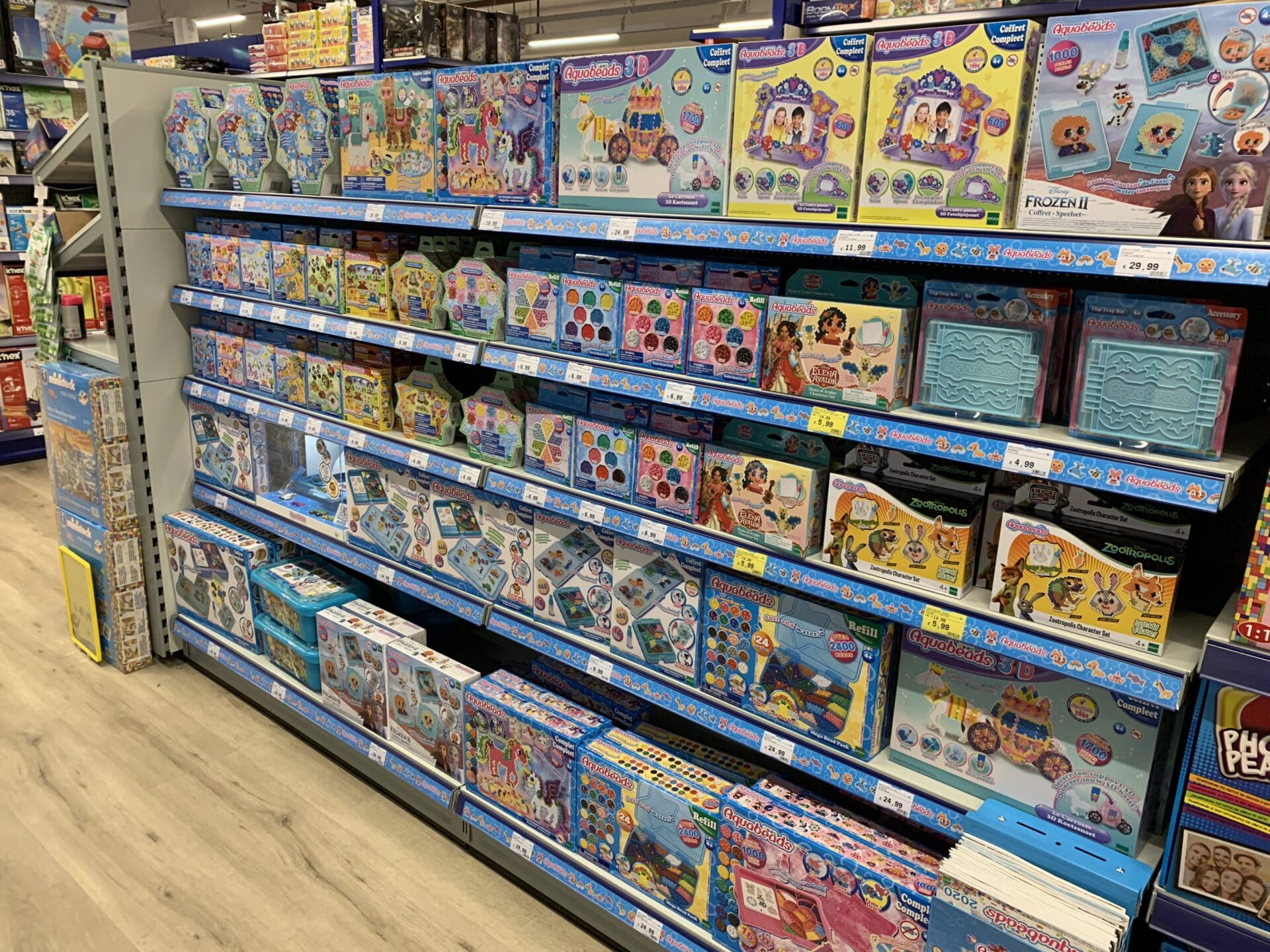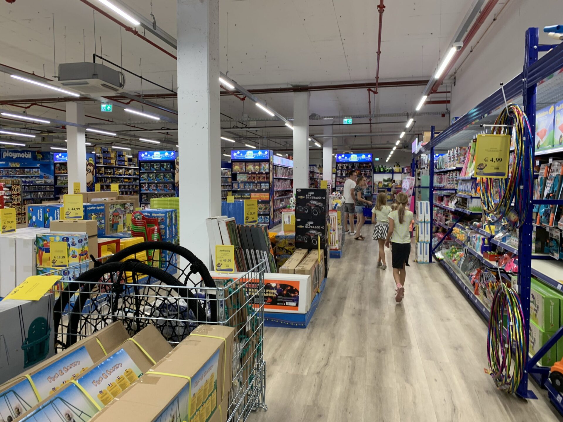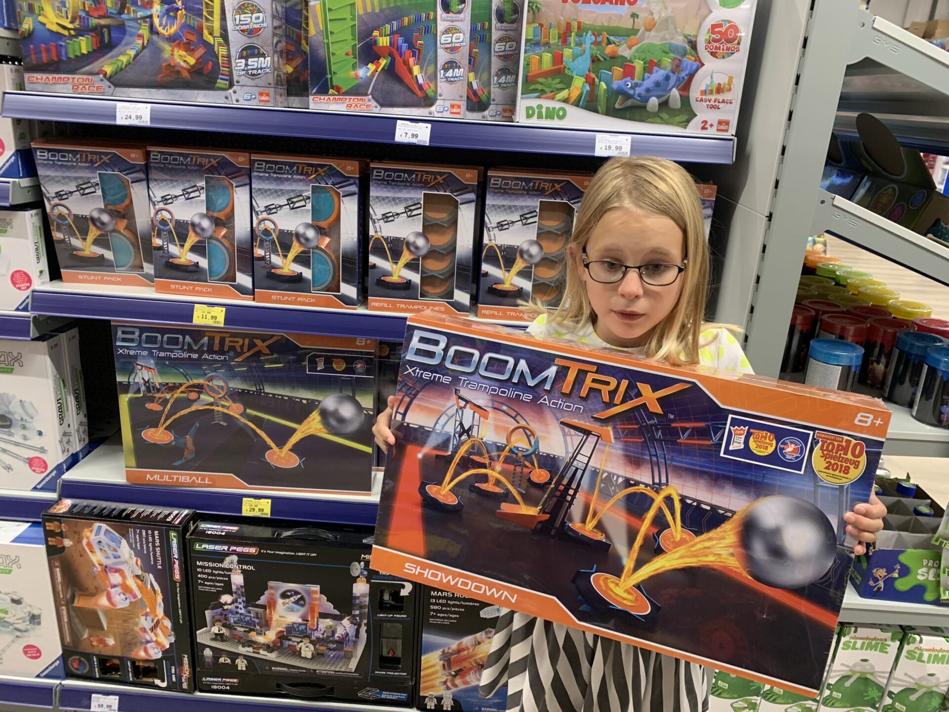 Groot! Wat ontzettend veel speelgoed heb je hier. Rijen vol om te bewonderen. Een gangpad vol Sylvanian Families, een gangpad met babyspeelgoed, Barbies, een groot schap LOL Surprise, buitenspeelgoed… Er is genoeg te kiezen! Verder zijn er verschillende ‘shop in shops’ zoals een groot display met allemaal Schleigh dieren, een Playmobil kamer, een Lego kamer… En wat me op viel: ook qua ontdek-speelgoed is er een groot aanbod. Niet alleen de Gravitrax, maar ook experimenteer sets en iets wat ik nog niet kende: BoomTrix (waarbij je een bal volgens trampolines een parcours laat stuiteren).