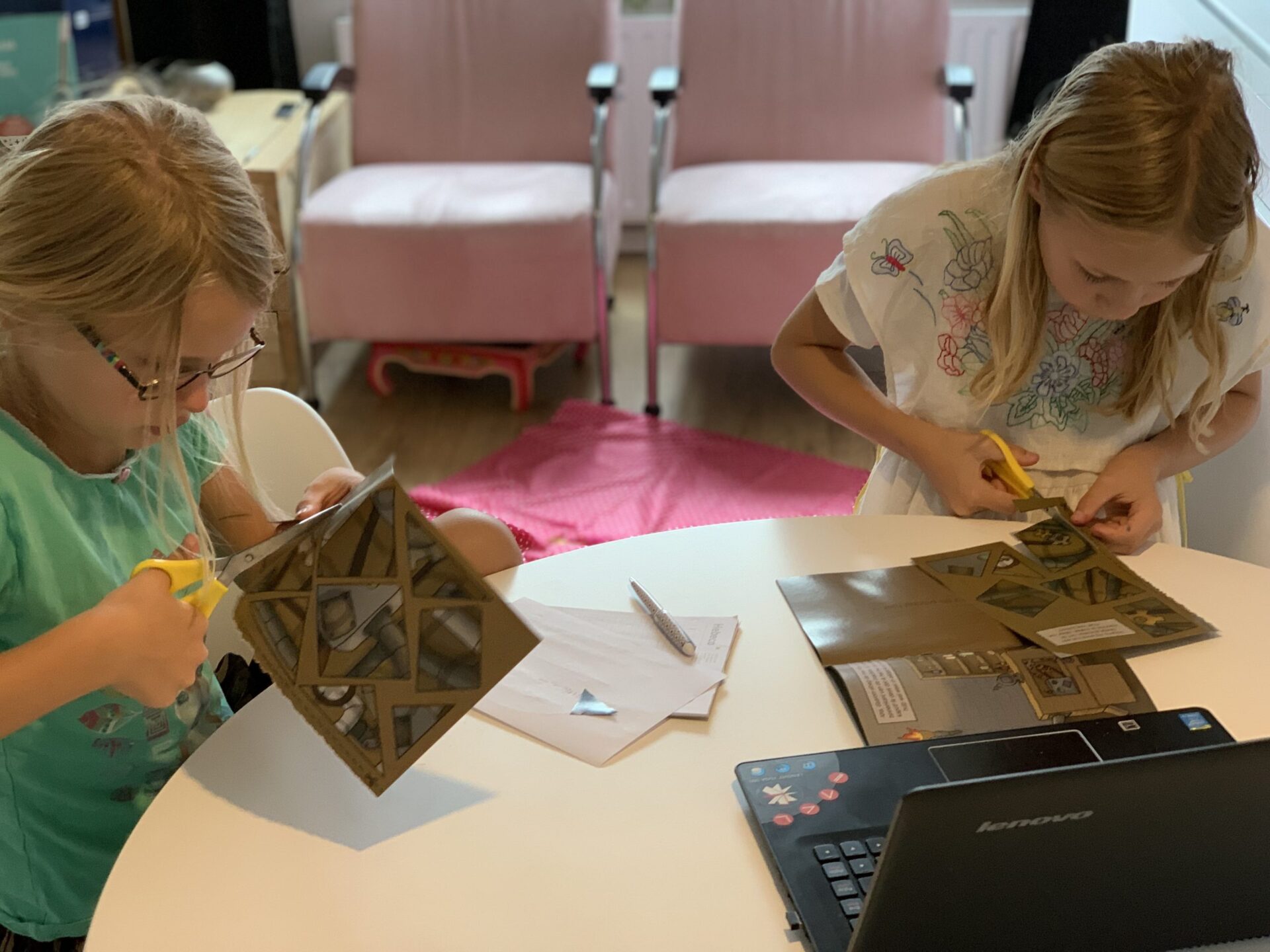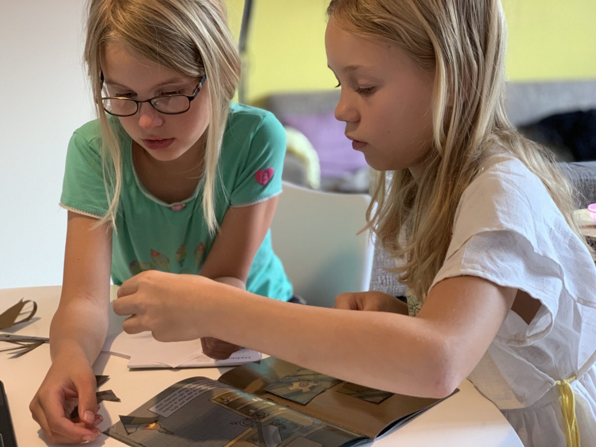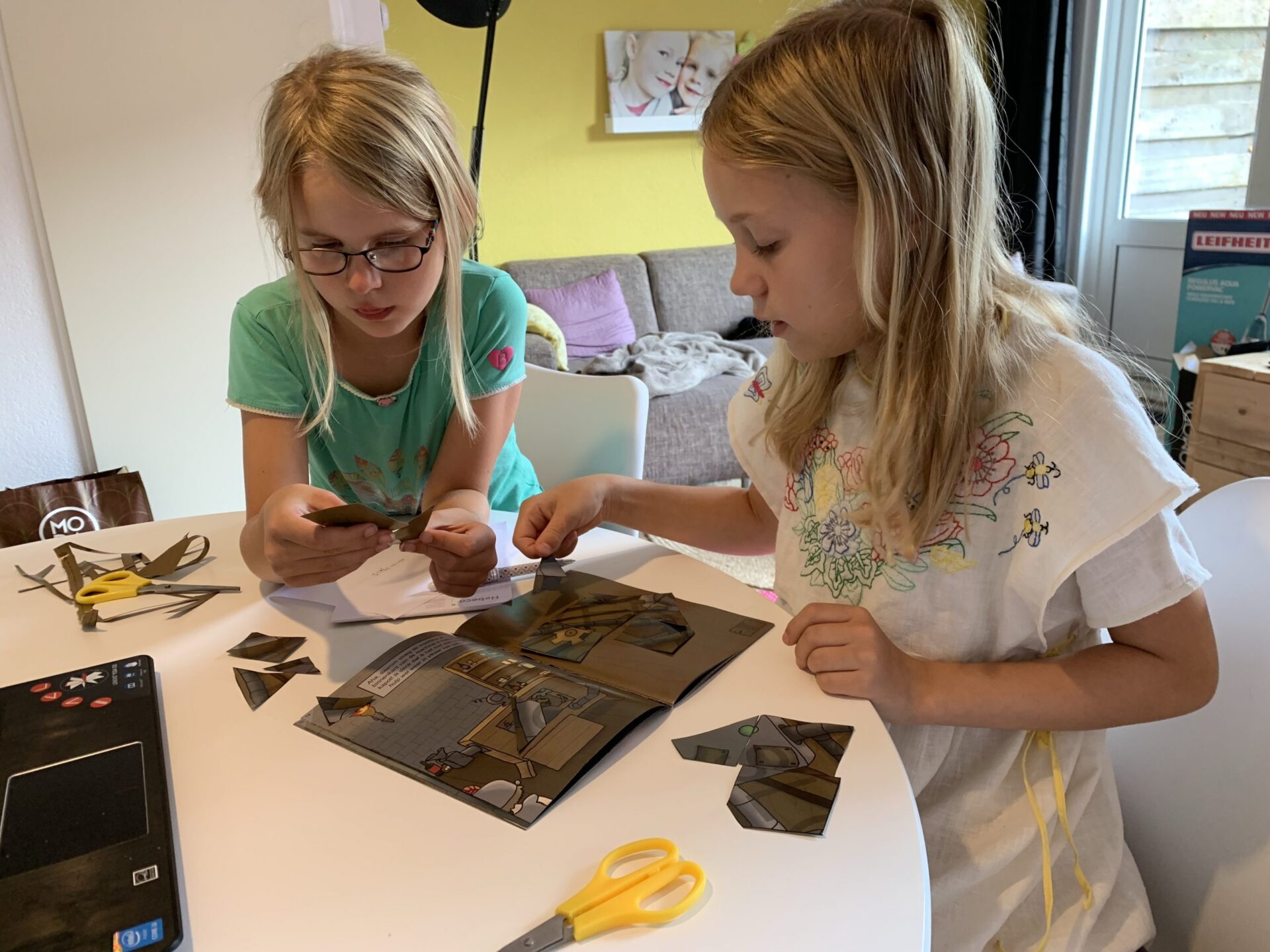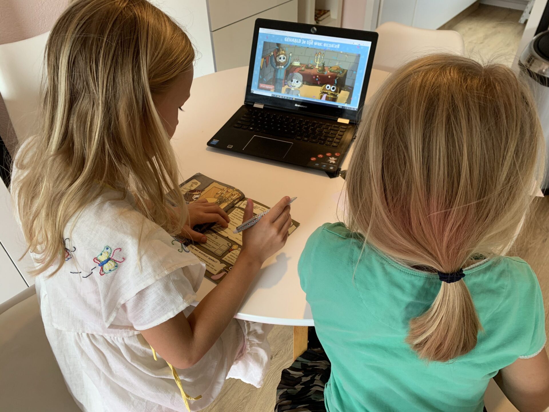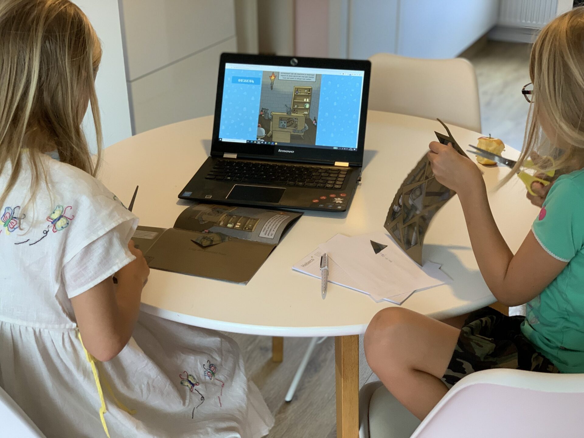 Terwijl wij lekker thuis aan de keukentafel zaten met de laptop, het avonturenboekje, pen, kladblaadjes en scharen, lazen we de instructies. Je vult op de website de startcode in en dan gaat de tijd lopen. In het boekje zie je wanneer je een oplossing op de website moet invullen. Hier kun je ook om hints vragen, wanneer je ergens niet uitkomt. (Hebben wij bij de hongerige boekenkast gedaan. Je krijgt dan straftijd, maar de hint helpt wel, haha.) De kinderen duiken in het avontuurlijke verhaal en lossen puzzels en raadsels op. Zo komen ze steeds een stapje verder in het avontuur. En mag je de bladzijde om slaan. Het is uiteindelijk de kunst om een zo goed mogelijke tijd neer te zetten. Als je het avontuur succesvol hebt afgerond, krijg je als beloning een diploma met je naam en eindtijd erop.