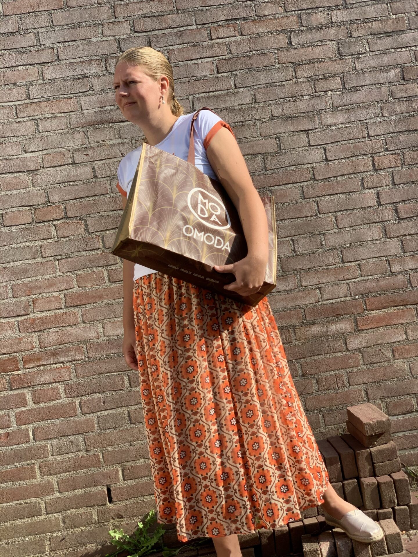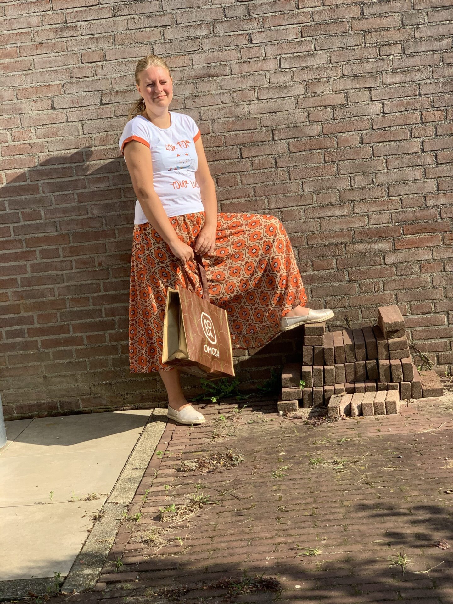 De gouden schoentjes matchen heel mooi bij verschillende outfits in mijn kast. Zomers zwart jurkje met bloemen, lange blauwe zomerjurk met bloempjes die ik in Spanje kocht en mijn roze handtasje, onder een broek… Maar als outfit of the day zien jullie vandaag mijn oranje outfit! Ik shopte deze in Valencia, in een leuk boetiekje in het oude stadscentrum dat bij gebrek aan toeristen opheffingsuitverkoop hield… Ze verkochten hier leuke merkjes en eigen handgemaakte ontwerpen. De lange oranje rok is van Maggie Sweet. Het t-shirt met de grappige poes en de uitspraak “Look for your Luck” komt van Lolina. En de TOMS – die je in allerlei printjes hebt – komen uit de webshop van Omoda, waar ik dames schoenen mocht uitkiezen. Een happy outfit dus en mijn kinderen vinden dat ik er leuk uitzie wanneer ik deze combinatie draag. Vind ik zelf ook. In de winter kan er prima een spijkerjack op en een panty onder met hoge laarsjes.