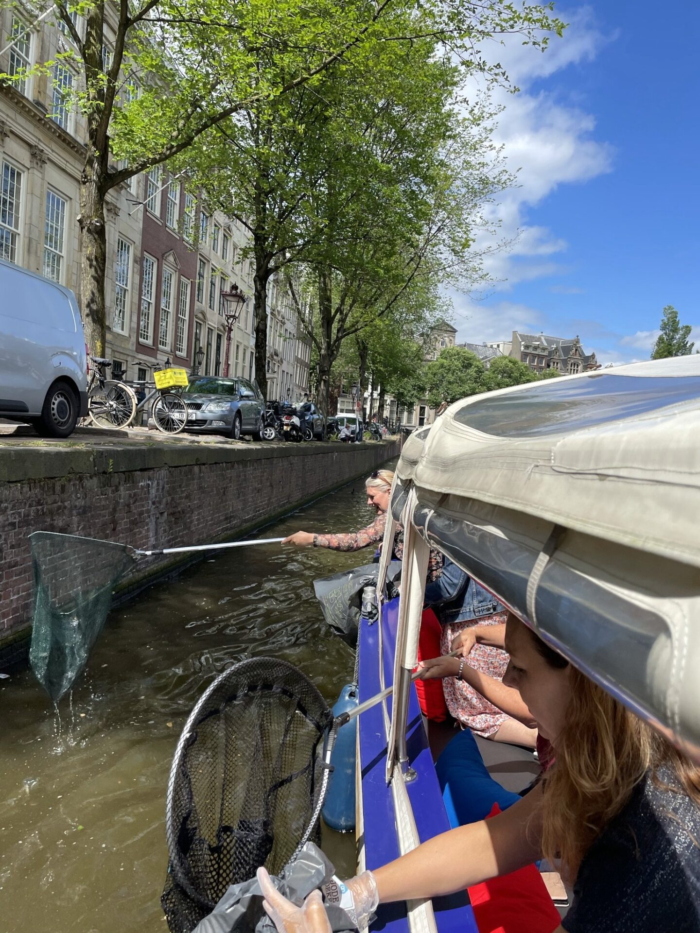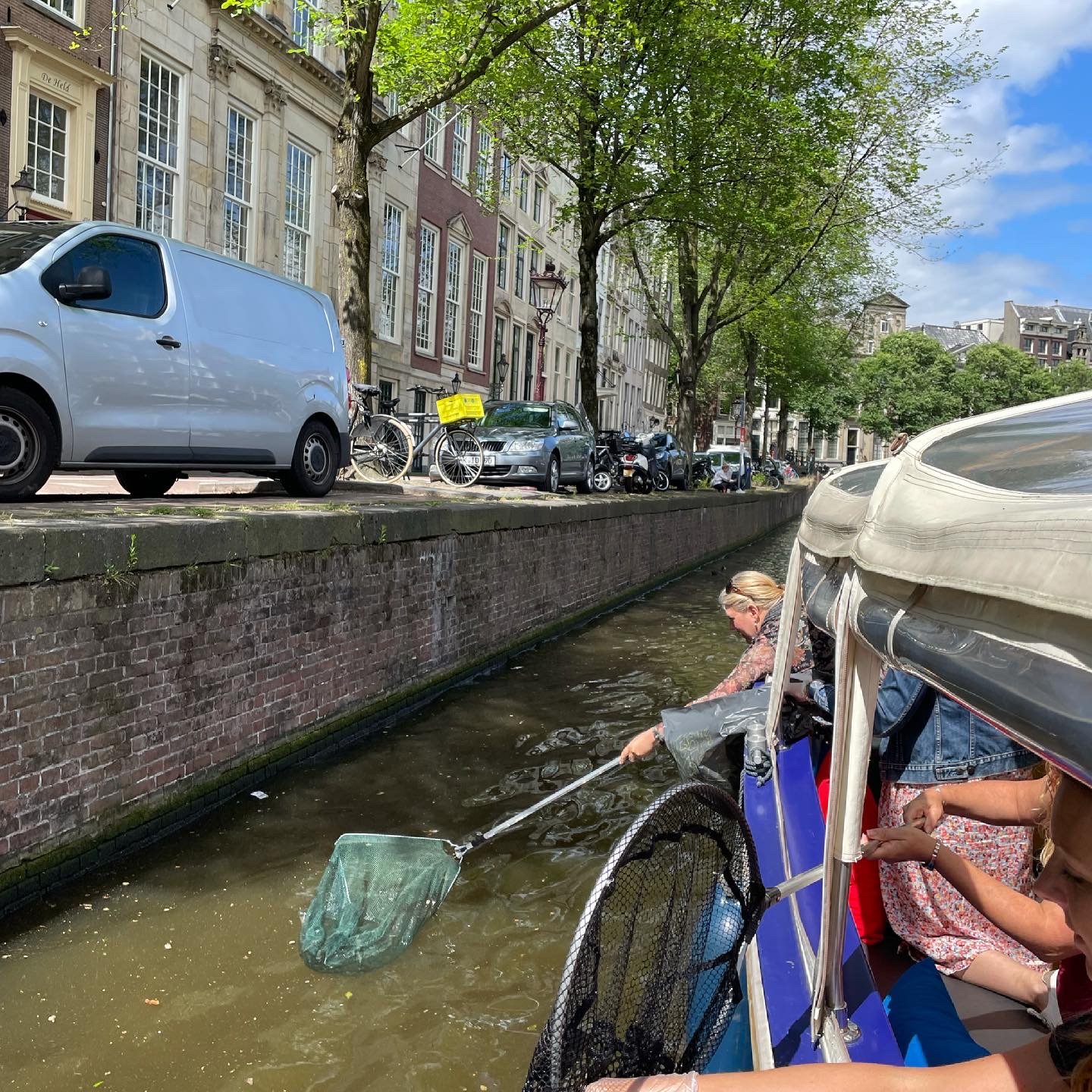 Duurzaam? Jup. Starboard Boats vaart elektrisch én we vissen tijdens het Blogboot event afval uit de grachten. Een stukje giving back en mensen langs de wal steken daarbij vaak hun duim omhoog omdat ze het waarderen.