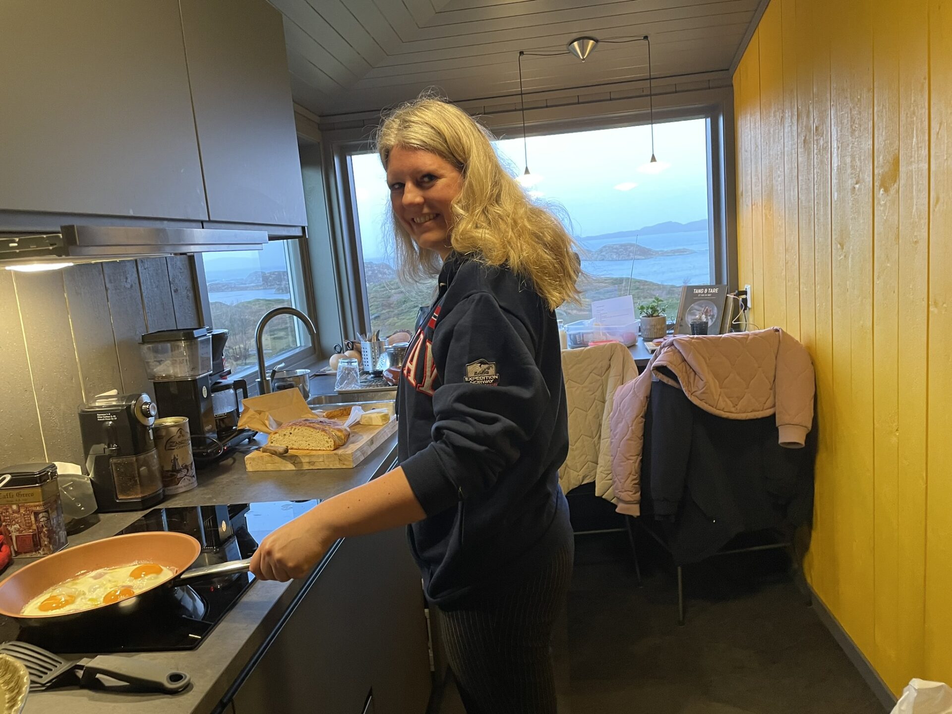Je kunt via de eigenaars een diner reserveren of zelf koken in het keukentje. Lamsstoof met pasta en groenten, in de ochtend verse eieren en zelfgebakken brood. Alles stond al klaar, dus de kinderen hebben gekookt. Op een heldere nacht kun je vanuit de hottub sterren kijken, wij troffen helaas minder weer maar het water was lekker warm. Het echte genieten begon bij het wakker worden: wat een uitzicht!