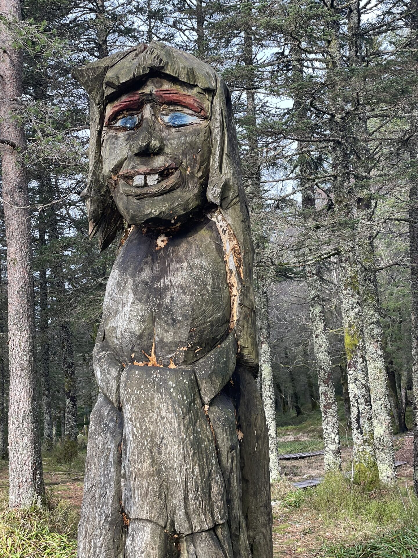 Er is een speeltuin voor kleine kinderen naast het café (waar ze heerlijke warme chocolademelk hebben), maar met tieners volg je (achter de toiletten) het bordje richting de houten trollen. Het is op zich al avontuurlijk om die allemaal te bekijken omdat je ook een beetje moet klimmen en klauteren, maar steek daarachter de weg over en je bent op de perfecte bosspeelplek voor tieners. Een enorme natuurspeeltuin met allerlei klimtoestellen en vooral ook een gave kabelbaan is in het landschap verwerkt. Rotsen, bomen en avontuur! What is not to like?
