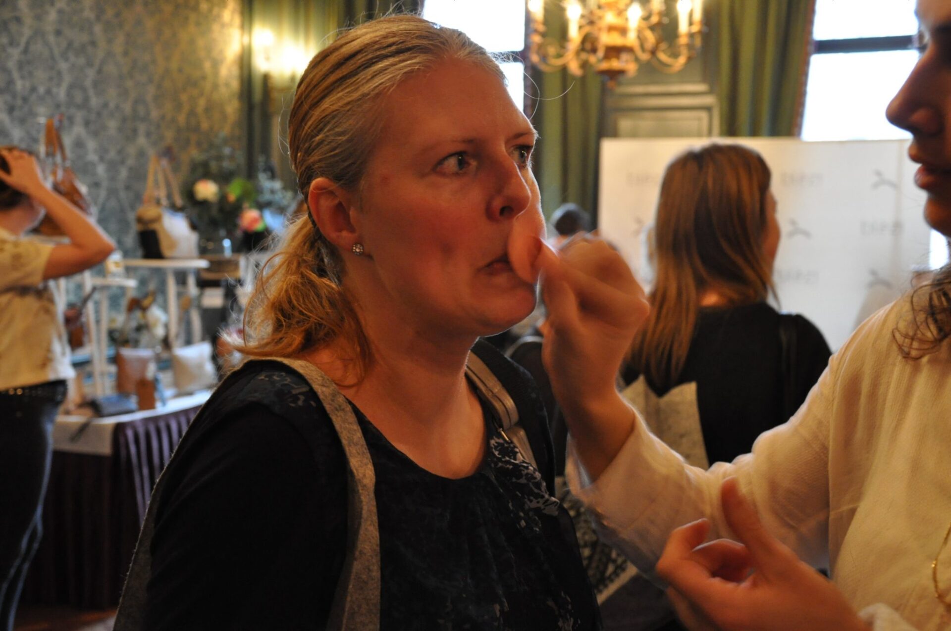 We werden ontvangen met bubbels, waar ik voor de foto even van genipt heb. Als ik rijd, drink ik niets. Daarna door naar het eerste merk Allure met haar Kristalpads. Een vernieuwende manier om snel en zacht ongewenste haartjes te verwijderen. Ik liet het demonstreren op mijn snor. Nu ik richting de 40 ga, komen daar toch af en toe wat harde stoppels tevoorschijn. Het voelde een klein beetje branderig, maar niet zo erg als bij waxen. En inderdaad: helemaal zacht en haarvrij! Daarnaast schijnt dit goed te zijn voor de doorbloeding. Je kunt de Kristalpads ook gebruiken voor je armen, benen, oksels en zelfs je bikinilijn. Ik ga het uitproberen, want ik kreeg een startersset mee van dit Zwitserse merk ter waarde van 39,95 euro.